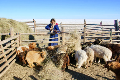 Family of the herder Tserevjav Chuluunbaatar seems luckier as they have not lost any animals so far. But despite the fact that their livestock of 32 heads is still alive, it is far from enough for him and his family of five to survive on. That is why Mr. Chuluunbaatar at the age of sixty-one is not only taking care of his own animals, but is also working as an assistant to another herder. “My fodder reserves are running out and we do not have any money to buy more. Your help will be just in time and we are very grateful”, says Mr. Chuluunbaatar while showing his newborn sheep.